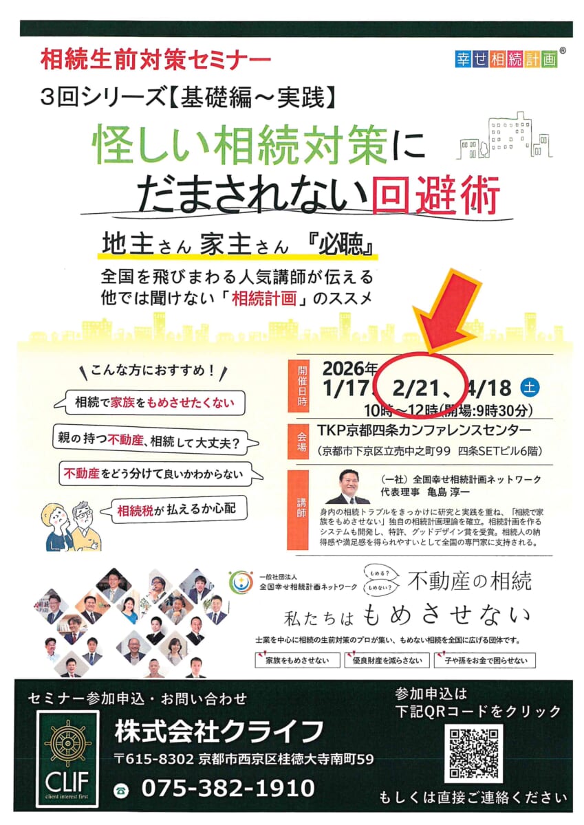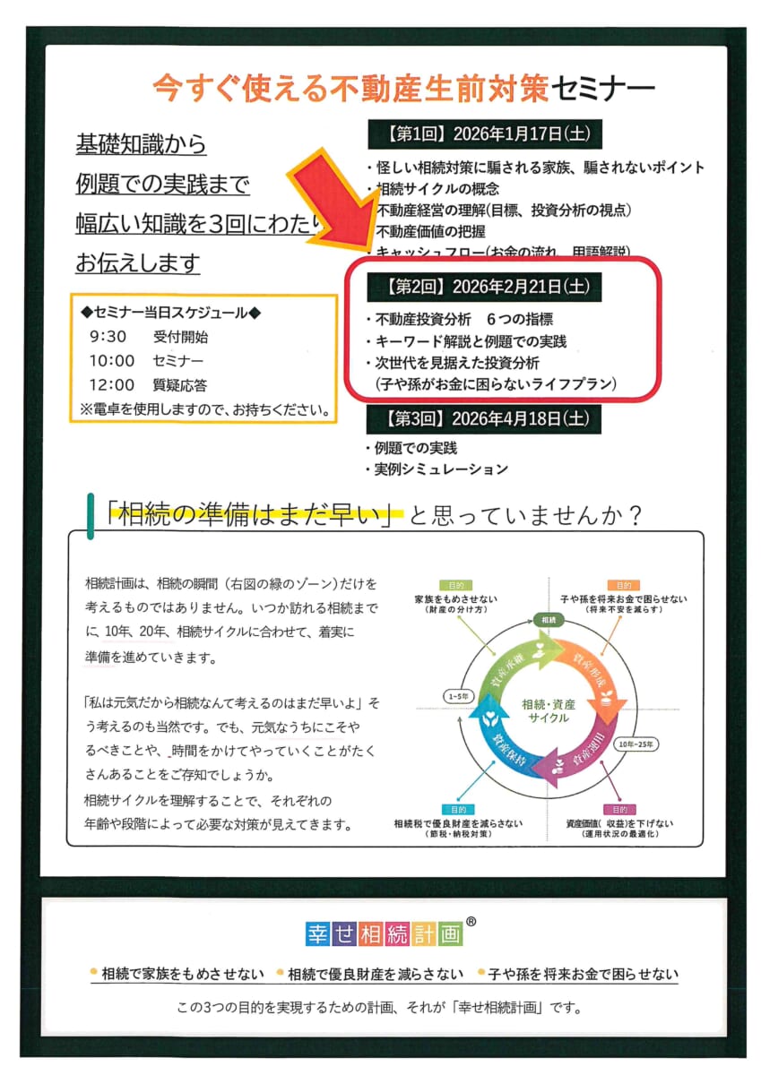 2月21日(土)に、3回シリーズの第2回目となる「相続生前対策セミナー」を開催いたします。